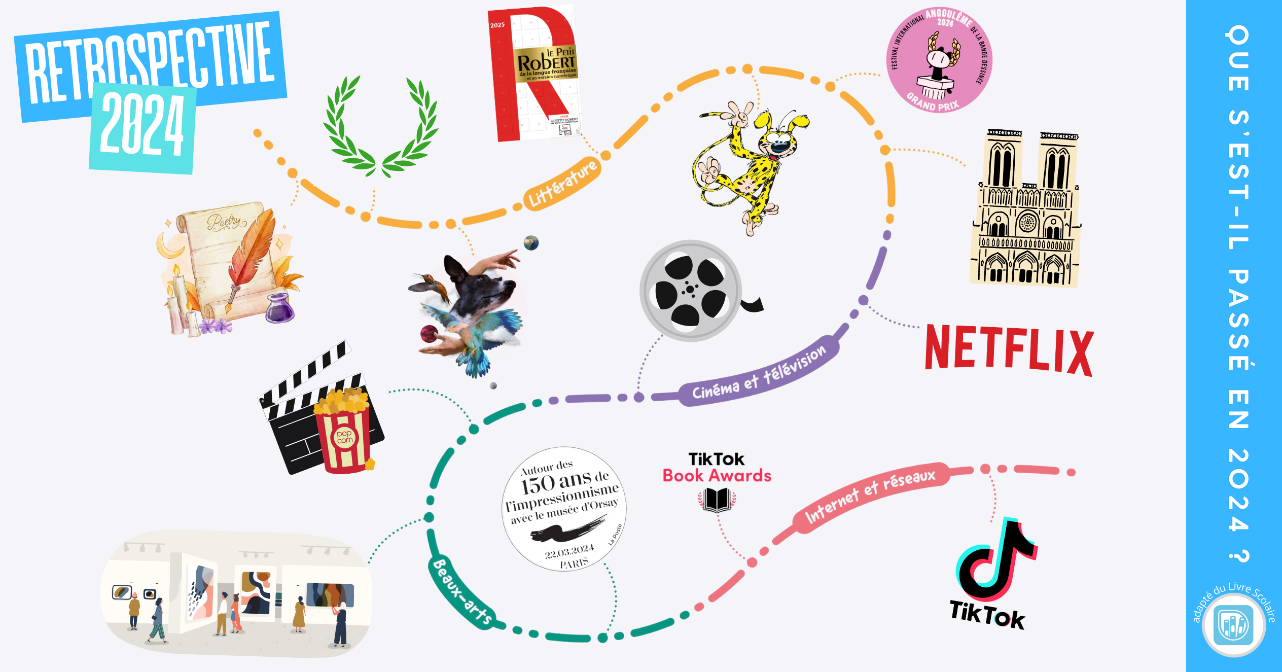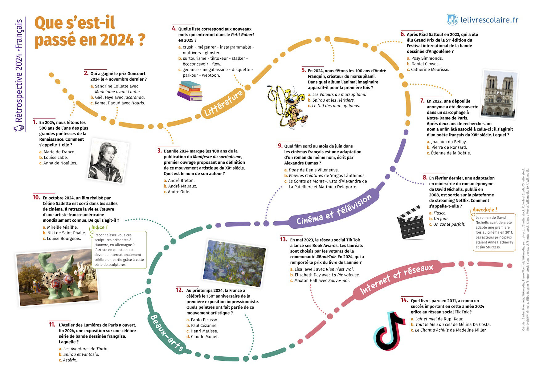 Je suis partie d’un contenu statique, conçu par Le Livre Scolaire et portant sur les événements qui se sont produits en 2024 sur la scène littéraire et, plus généralement, artistique. Il s’agit d’un PDF qui invite à répondre à 14 QCM, agrémentés d’illustrations, d’anecdotes et d’indices, et disposés le long d’une ligne sinueuse. La ressemblance avec un plateau de jeu de société (type « jeu de l’oie ») m’a tout de suite donné l’idée de le transposer dans le module « Game Map » de H5P :